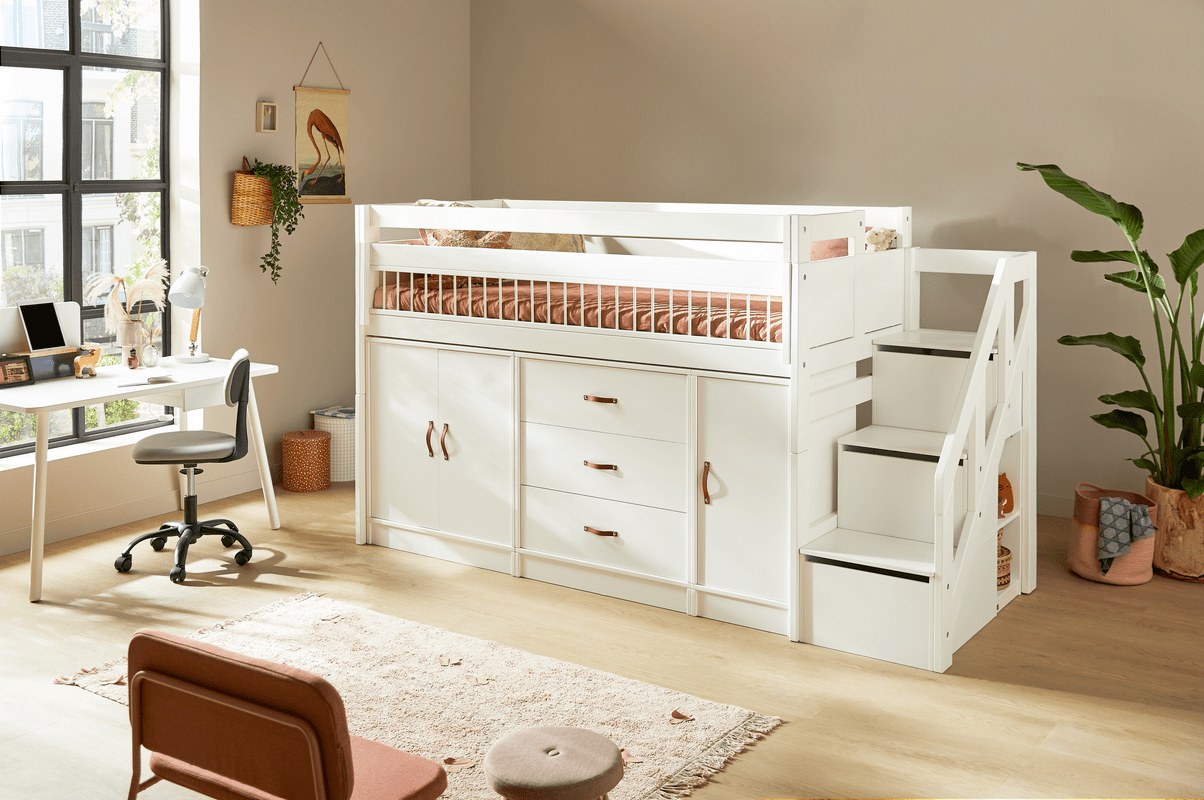 Dieses Treppenmodul verbindet Komfort und Funktionalität in einem platzsparenden Design, das nicht nur praktisch ist, sondern auch das Kinderzimmer aufgeräumt und organisiert hält. Perfekt für Eltern, die auf der Suche nach einer ästhetischen und funktionalen Lösung für das Kinderzimmer sind.